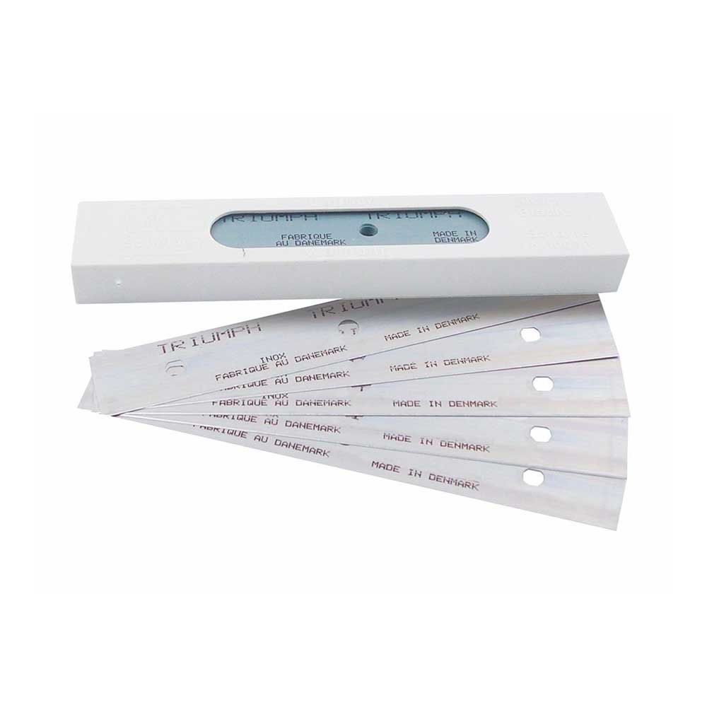 Barberblad til Triumph skrape (5016). Svært skarpe og effektive blader med 2 egger. 25 stk i plastdeksel med rom for brukte blader.